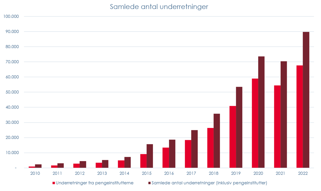 Pengeinstitutterne underretter mistænkelige transaktioner og aktiviteter til Hvidvasksekretariatet, så de kan undersøge, om der er foregået noget kriminelt. Underretningerne er mangedoblet de senere år.