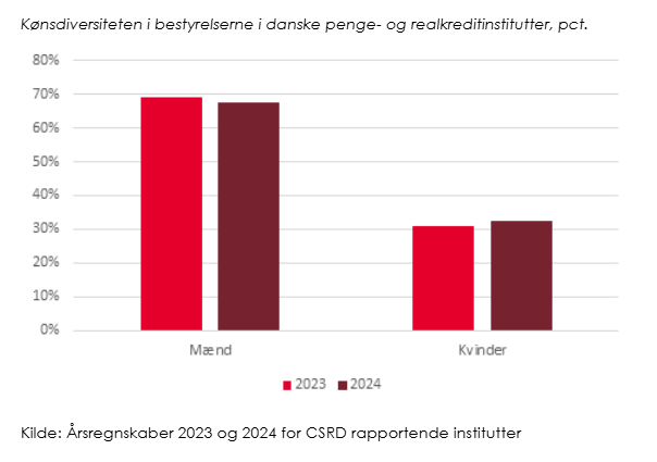 De største danske penge- og realkreditinstitutter med hovedsæde i Danmark har i forbindelse med årsrapportering for 2024 været forpligtet til at oplyse om kønsdiversiteten i bestyrelserne i overensstemmelse med kravene til bæredygtighedsrapportering (CSRD).