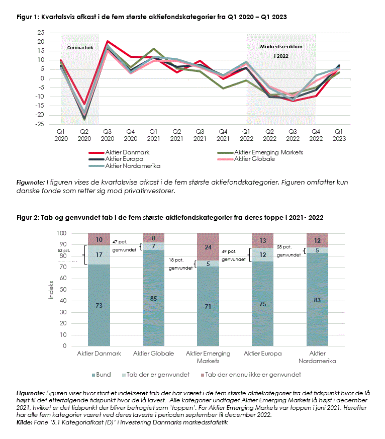 Ser man på de fald, der har været i de fem største kategorier af aktiefonde fra deres højeste niveauer inden 2022 til deres laveste niveauer i løbet af 2022, så er det tydeligt, at der stadig er et stykke vej, før tabene er genvundet. Det gælder især for emerging markets aktiefonde, som stadig er 24 pct. under deres højeste niveau i sommeren 2021. Derimod har fondene i kategorien ’Aktier Danmark’ efter en god start på 2023 genvundet 17 ud af de tabte 27 pct. Ser man på obligationsfondene, er der også lang vej endnu. De har i gennemsnit kun indhentet 24 pct. af de tab, som de oplevede i 2022 og til dels også under coronakrisen.