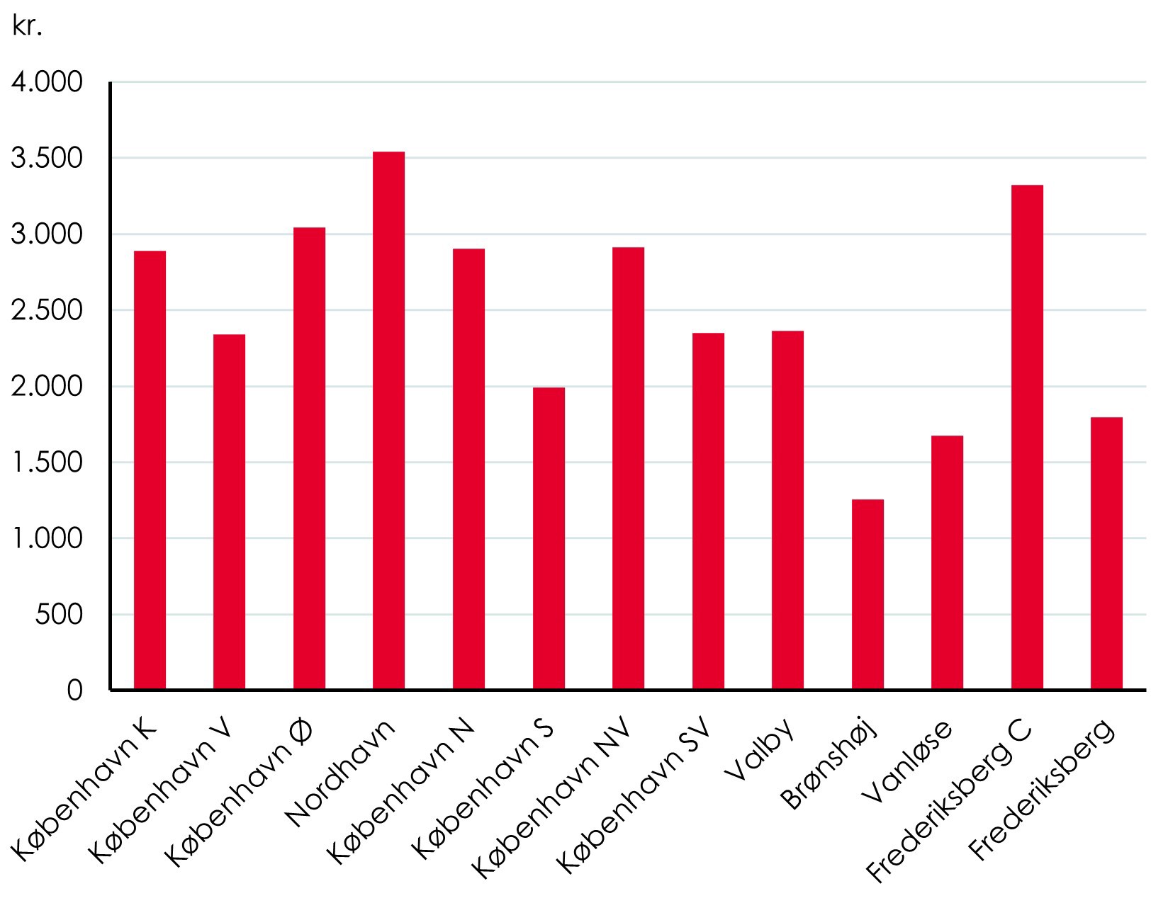 Ser man på de enkelte bydele i København og Frederiksberg, er prisudviklingen tydelig. I godt en tredjedel af bydelene er salgspriserne for en gennemsnitlig ejerlejlighed steget med omkring en million kr. det seneste år. Nordvest har haft den største stigning med godt 26 pct., mens Frederiksberg ligger lavest med en stigning på 13 pct.