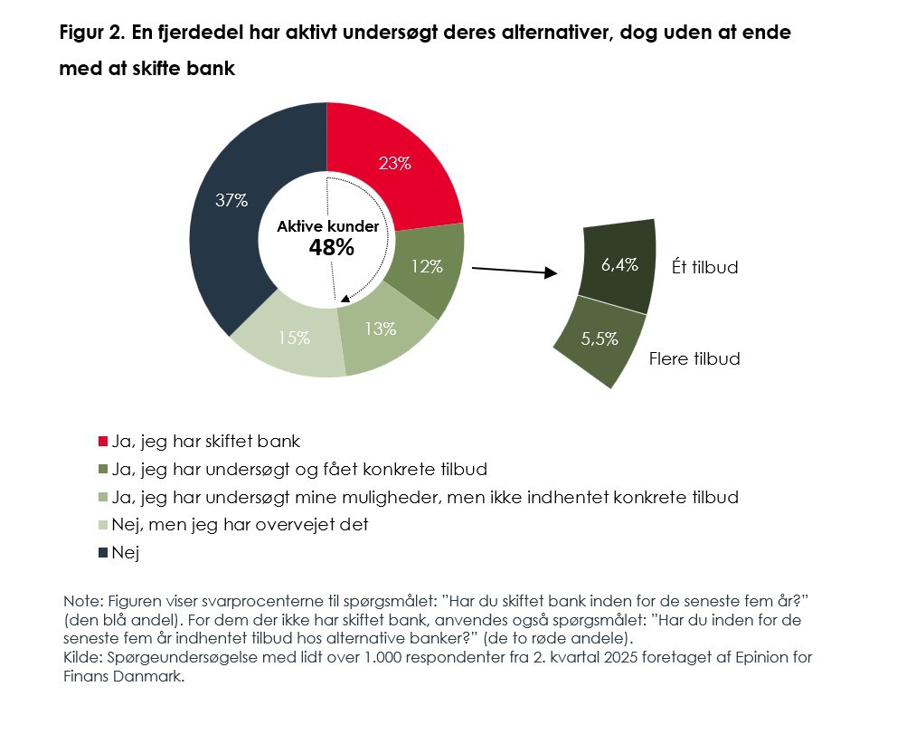 Samtidig er det blevet markant nemmere at skifte bank. Den finansielle sektor har i de seneste år investeret massivt i konkurrencefremmende løsninger – senest med etableringen af eBankskifte. Løsningen gør det enkelt for kunder at indhente tilbud fra andre banker og gennemføre et eventuelt skifte. Hele syv ud af ti danskere, der har skiftet bank, oplever, at processen er nem.