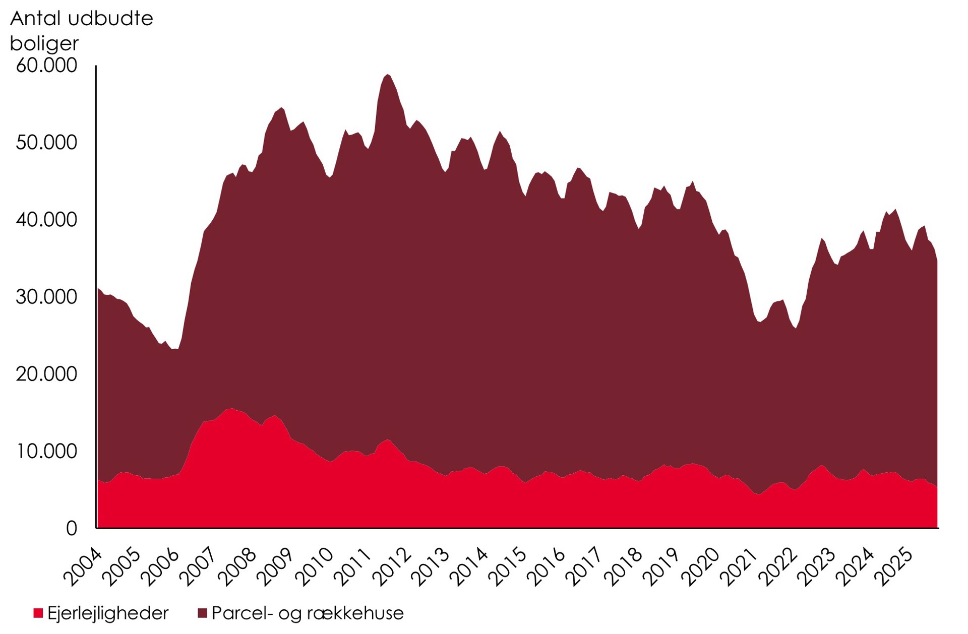 - Ved indgangen til november 2025 var der 34.641 udbudte huse og ejerlejligheder til salg. Det svarer til et fald på 14 pct. i forhold til samme tidspunkt sidste år. Tilbagegangen i boligudbuddet ses på tværs af alle landsdele.