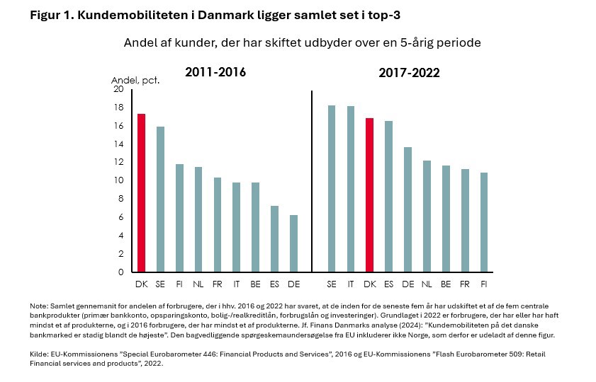 Det danske bankmarked er præget af en sund konkurrence. Når én bank har et godt tilbud, vil de andre som regel også være med. Det er godt for kunderne – og tvinger bankerne til at holde sig skarpe. Kunderne er samtidig aktive og kritiske i deres valg af bank og undersøger ofte muligheder og priser hos konkurrerende banker. Faktisk ligger danske bankkunder i top-3 blandt sammenlignelige EU-lande, når det handler om at skifte bank.