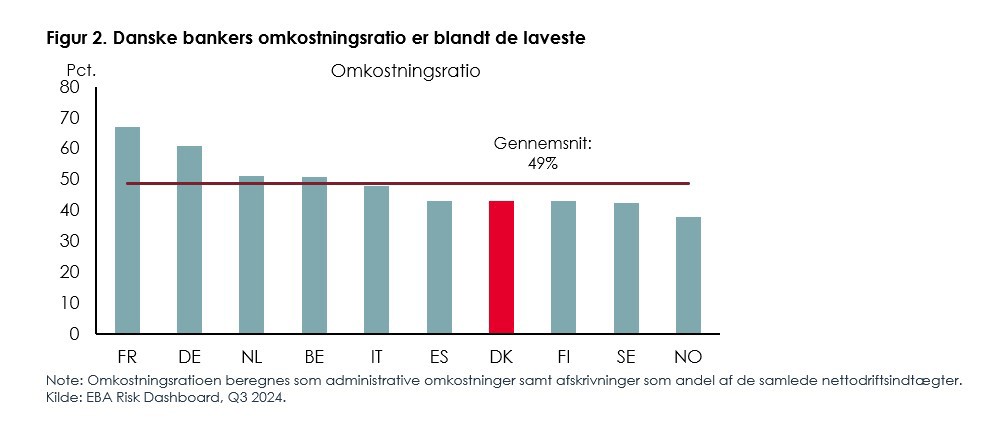 Den skarpe konkurrence og høje mobilitet presser samtidig bankerne til at være mere effektive. Målt på omkostninger og effektivitet ligger danske banker blandt de bedste, når man holder dem op mod sammenlignelige europæiske lande.