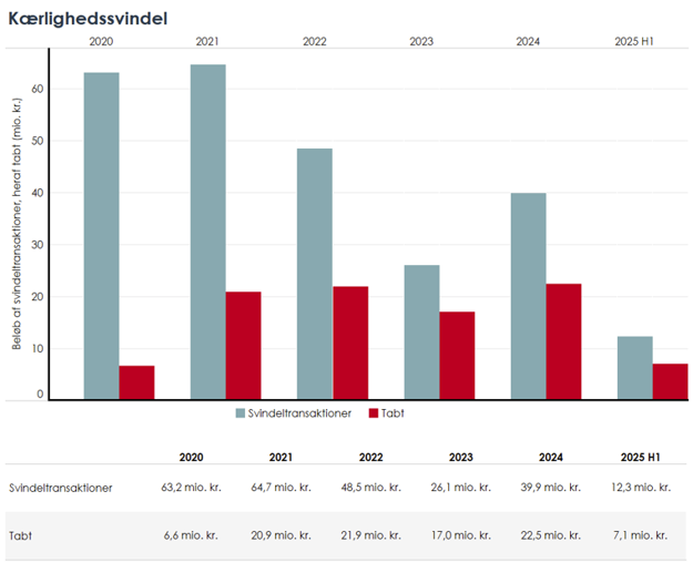 Den såkaldte kærlighedssvindel er i årets første seks måneder faldet i forhold til halvåret før. Bankerne har i andet halvår 2024 indberettet 340 sager om kærlighedssvindel, hvor de kriminelle har forsøgt at stjæle 19,4 mio. kr. fra deres ofre – og sluppet afsted med 12,8 mio. kr. Det tal er i første halvår 2025 faldet til 278 sager, hvor der er forsøgt svindlet for 12,3 mio. kr. og med et tab på 7,1 mio. kr.
