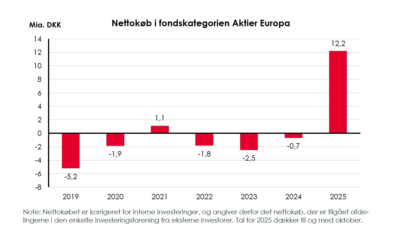 I oktober blev der købt danske investeringsfonde med europæiske aktier for mere end 1 mia. kr. netto. Det er det næsthøjeste blandt alle fondskategorier. Samtidigt er det 9. måned i træk med et positivt nettokøb i disse fonde – og et samlet nettokøb på godt 12 mia. kr. år-til-dato. I historisk perspektiv er det ekstremt høje niveauer for en kategori, som gennem senere år har været i tilbagegang. Over de seneste seks år har fondskategorien Aktier Europa kun haft et positivt nettokøb i 2021, hvor der samlet blev købt op for godt 1 mia. kr.