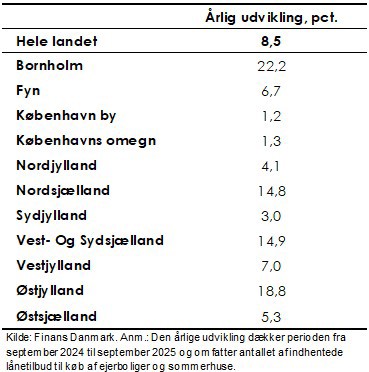 - Den største stigning i lånetilbud til ejerbolig og sommerhuse fandt sted på Bornholm og i Østjylland, hvor antallet steg med henholdsvis godt 22 pct. og knap 19 pct. sammenlignet med sidste år.