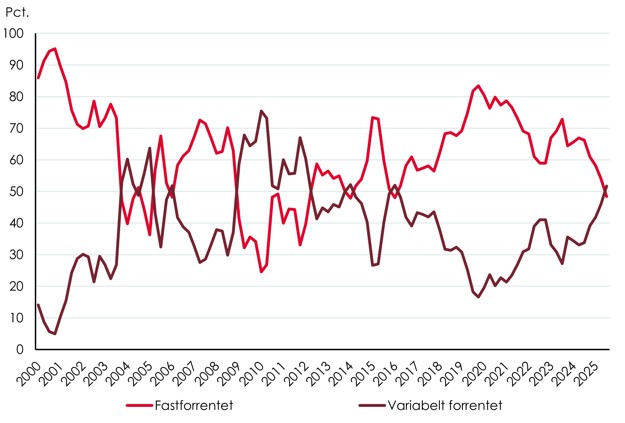 Af dem, der finansierede boligkøbet med et realkreditlån, valgte knap 52 pct. et lån med variabel rente. Det er første gang i lidt over ni år, at denne tendens gør sig gældende. Siden årtusindskiftet er det kun sket i 22 ud af 103 kvartaler, at variabelt forrentede lån har været boligkøbernes foretrukne valg.