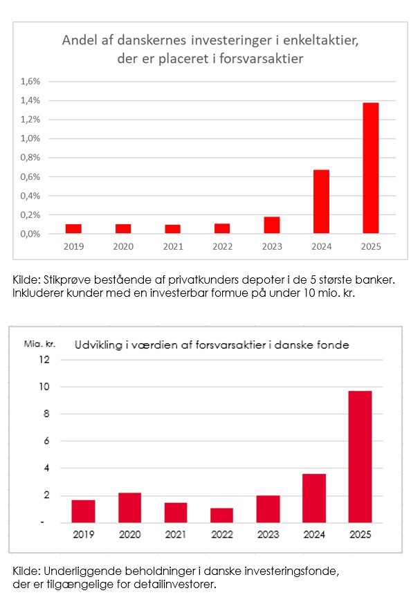Andelen af danskernes investeringer i enkeltaktier, der er placeret i forsvarsaktier, er 17-doblet siden 2019 – fra under 0,1 pct. til knap 1,5 pct. i 2025. Det svarer til, at der i dag investeres næsten 1.000 kr. i forsvarsaktier for hver 60 kr. i 2019. Samtidig er værdien af forsvarsaktier i danske fonde femdoblet på blot to år, fra omkring 2 mia. kr. i 2023 til næsten 10 mia. kr. i 2025. Det viser nye tal fra Finans Danmark.