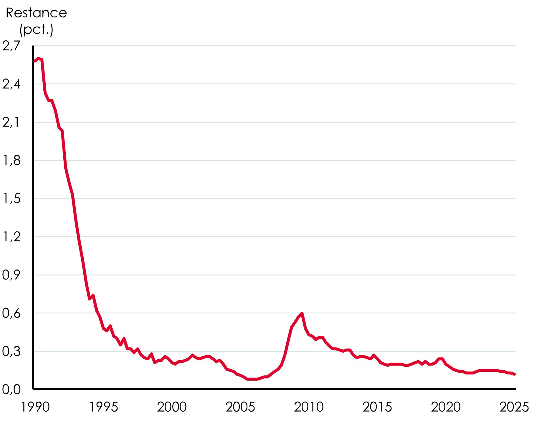 - Restanceprocenten, som angiver andelen af boliglån, hvor betalingerne ikke sker som aftalt, lå i 2. kvartal 2025 på 0,12 pct. Det svarer til, at boligejerne i gennemsnit manglede at betale 12 øre for hver 100 kr. i terminsydelse.
