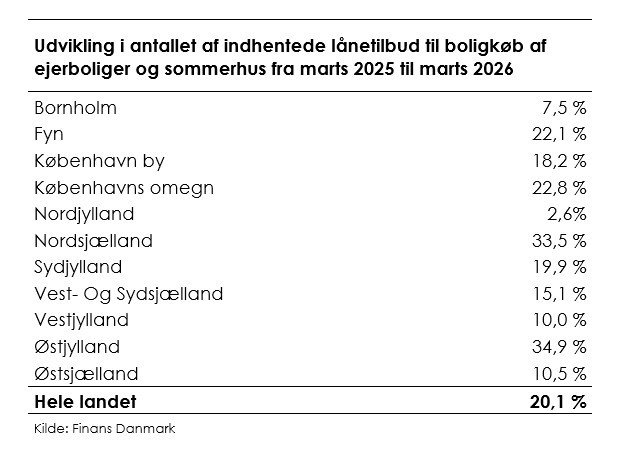 - Fremgangen er bred: Sammenlignet med marts sidste år ses der positiv vækst i antallet af indhentede lånetilbud til boligkøb af ejerboliger og sommerhuse i hele landet. Aktiviteten er steget markant, og Østjylland og Nordsjælland ligger i spidsen med stigninger på henholdsvis 34,9 og 33,5 pct.