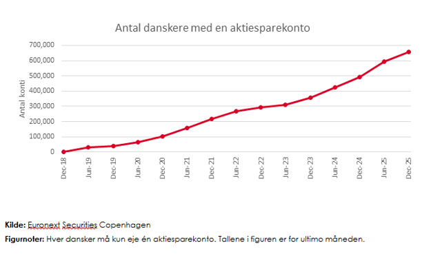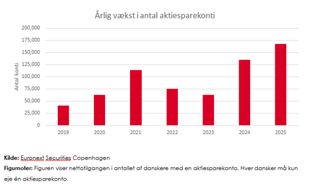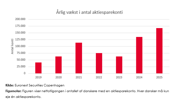 Væksten i antallet af danskere med en aktiesparekonto satte i 2025 rekord for andet år i streg. I 2025 var stigningen på 167.000, hvilket er flere end den tidligere rekord fra 2024 på 135.000. Væksten i 2025 var især drevet af et meget stærkt første halvår med en tilgang på 103.000 nye konti, mens stigningen i andet halvår landede på mere moderate 65.000, der dog fortsat er den tredjestørste halvårsvækst siden ordningen blev etableret.