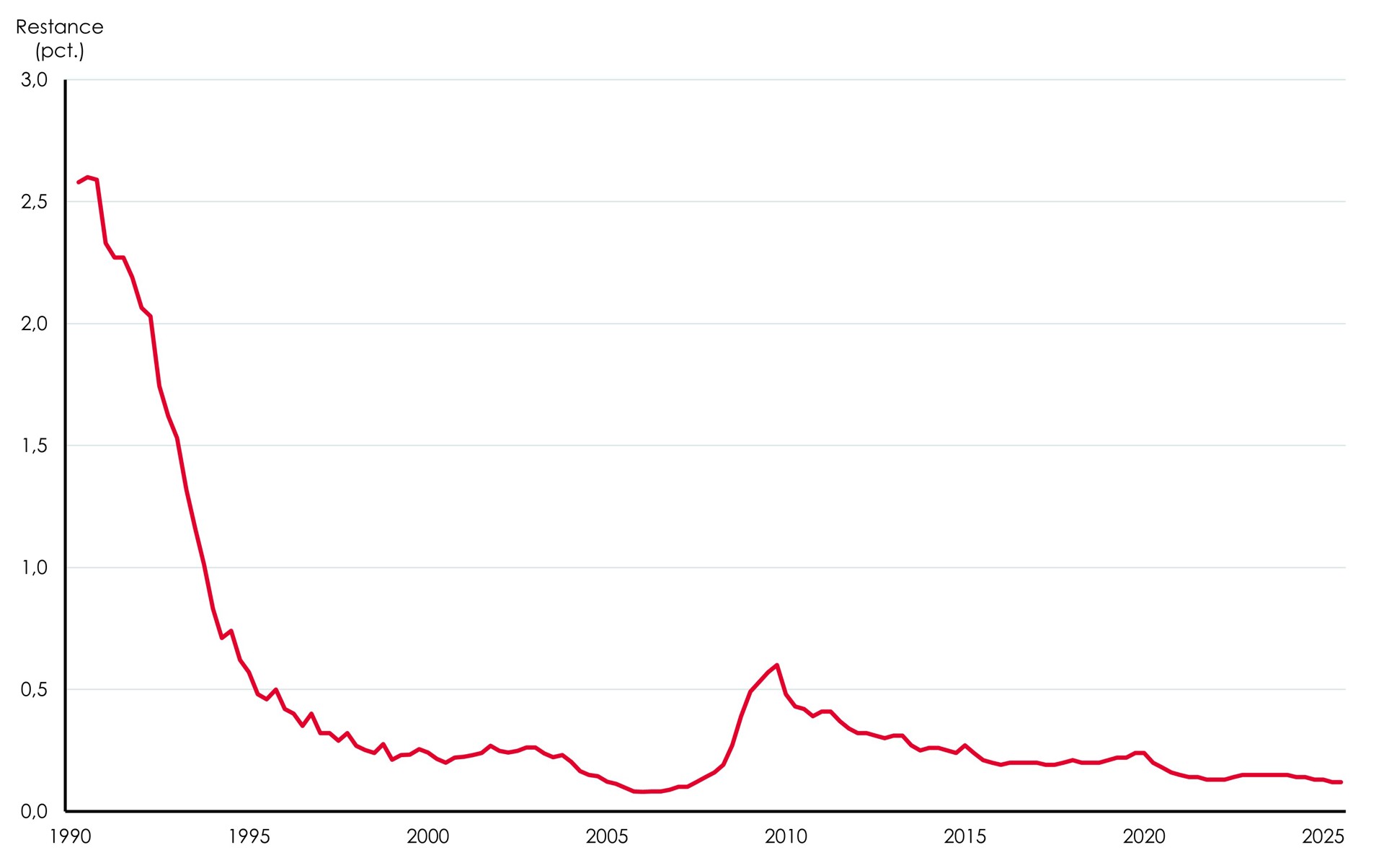 - Siden 2009 er restanceprocenten gradvist faldet og har de seneste fire år ligget på et meget lavt og stabilt niveau.