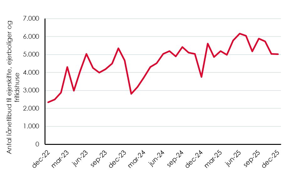 - Af disse var 5.027 lånetilbud køb af ejerbolig eller sommerhus. Det er næsten 34 procent flere end i december 2024.