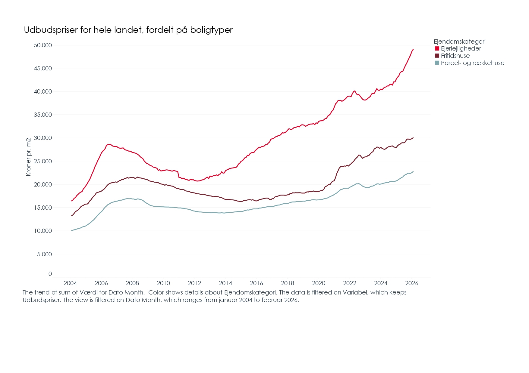 - Ejerlejligheder i hele landet udbydes nu til historisk høje kvadratmeterpriser. På landsplan er udbudspriserne steget til 49.088 kr. pr. kvadratmeter, hvilket svarer til en stigning på 14 pct. det seneste år. Stigningen er især drevet af København og Frederiksberg, hvor kvadratmeterpriserne nu er oppe på henholdsvis 83.111 kr. og 86.353 kr. Det svarer til årlige stigninger på 17,4 pct. og 22,2 pct. Alene den seneste måned er priserne steget med henholdsvis 0,4 pct. og 3,1 pct.