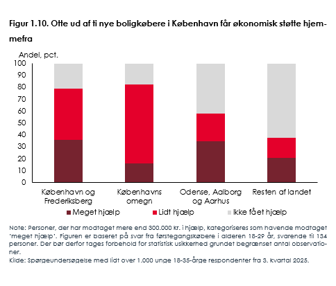 Unge boligkøbere i København er dog langt fra de eneste, der får økonomisk støtte hjemmefra. Mange unge får også hjælp, når de køber bolig i Odense, Aarhus og Aalborg. Men det drejer sig om en mindre andel. Samtidig er det blot omkring en tredjedel af de unge i resten af landet, som oplever, at det er svært at komme ind på boligmarkedet.