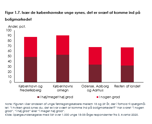 Halvdelen af de unge, der bor i eller omkring København, siger i en spørgeundersøgelse i rapporten, at de synes, det i høj grad eller meget høj grad er svært at komme ind på boligmarkedet.