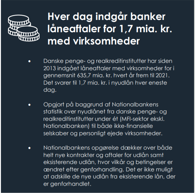 Banker og realkreditinstitutter er hele Danmarks finansielle motor: Hver dag indgår banker låneaftaler med private virksomheder for 1,7 mia. kroner, i de kommende år investeres der op mod 1 mia. kr. i udviklingen af danskernes nye digitale identitet MitID og allerede i dag er der udlånt 460 mia. kroner til grønne og bæredygtige aktiviteter.