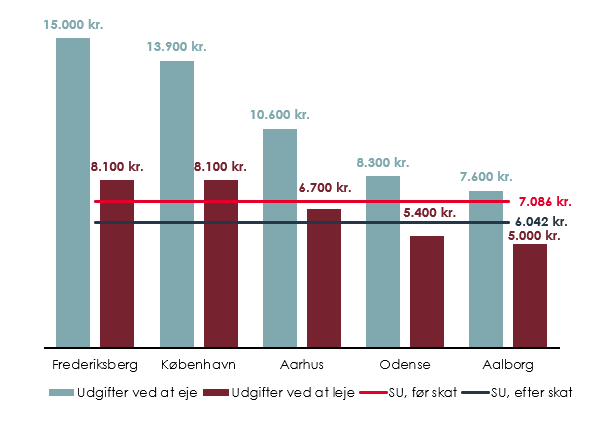 I de store studiebyer – København, Frederiksberg, Odense, Aarhus og Aalborg – overstiger udgifterne til en mindre, gennemsnitlig ejerlejlighed på 50 kvm SU-satsen for udeboende studerende før skat på 7.086 kr. Aalborg ligger tættest på SU’en med månedlige udgifter på omkring 7.600 kr., mens det på Frederiksberg koster 15.000 kr. om måneden for en tilsvarende lejlighed. Et billigere alternativ kan være en privat lejebolig – særligt vest for Storebælt. I Aalborg, som er den billigste af de fem byer, ligger huslejen for en typisk nyopført privat lejebolig på 50 kvm på knap 5.000 kr., mens den i København og på Frederiksberg ligger omkring 8.100 kr. om måneden. Et andet alternativ kan være en almen- eller studiebolig, men her kan ventetiderne ofte være lange – særlig tæt på sit studie.