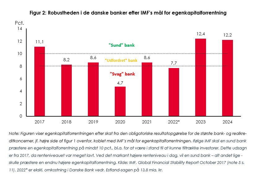 I 1. halvår 2025 opnåede de største danske bank- og realkreditkoncerner et samlet overskud på 26,8 mia. kr. efter skat, en tilbagegang fra året før. Faldet i indtjening skyldes især lavere nettorenteindtægter i lyset af et lavere renteniveau. Dansk økonomi, er dog fortsat robust og det betyder, at bankernes tab på lån er historisk lave. Bankernes samlede kapitalniveau er fortsat fornuftigt, hvilket giver en god økonomisk buffer mod fremtidige tab.