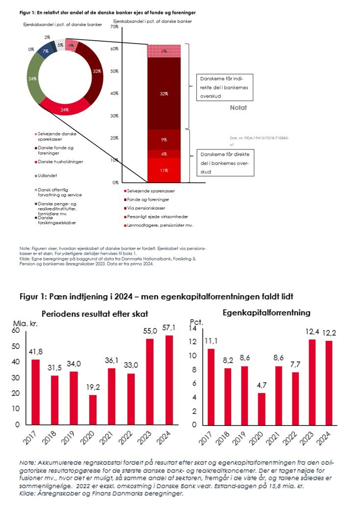 Analysen viser, at danske husholdninger tilsammen ejer 24 pct. af banksektoren, opgjort i værdi. Til sammenligning ejer danske husholdninger 14 pct. af andre ikke-finansielle virksomheder. De danske husholdningers ejerandel på 24 pct. fordeler sig sådan, at lønmodtagere og pensionister ejer 11 pct. af de danske banker gennem deres egne investeringer i bankaktier, og små danske personligt ejede virksomheder som landmænd, håndværkere mv. ejer 4 pct. af bankerne. Desuden ejer danskerne indirekte 9 pct. via deres pensionsopsparinger, fordi pensionskasserne investerer nogle af pensions-midlerne i bankaktier. Det mærkes nødvendigvis ikke her og nu, men bidrager til danskernes økonomiske tryghed på længere sigt, når pensionen en dag skal udbetales.